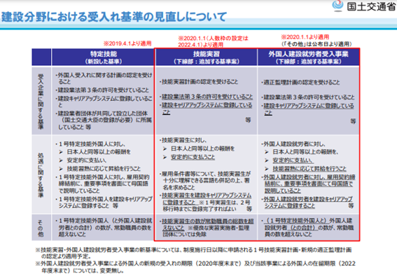 - 2018年の経済財政運営と改革の基本方針に基づき、建設分野における深刻な人手不足に対応するため、外国人労働者を受け入れる制度が導入されました。